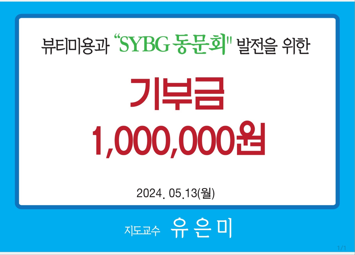 ○ 유은미 지도교수는 본교 모교 졸업생으로서 사제지간을 넘어 사석으로는 선, 후배가 되는 야간  동문회 발전을 위한 소정의 금액 1,000.000원을 기부해 주셨다.