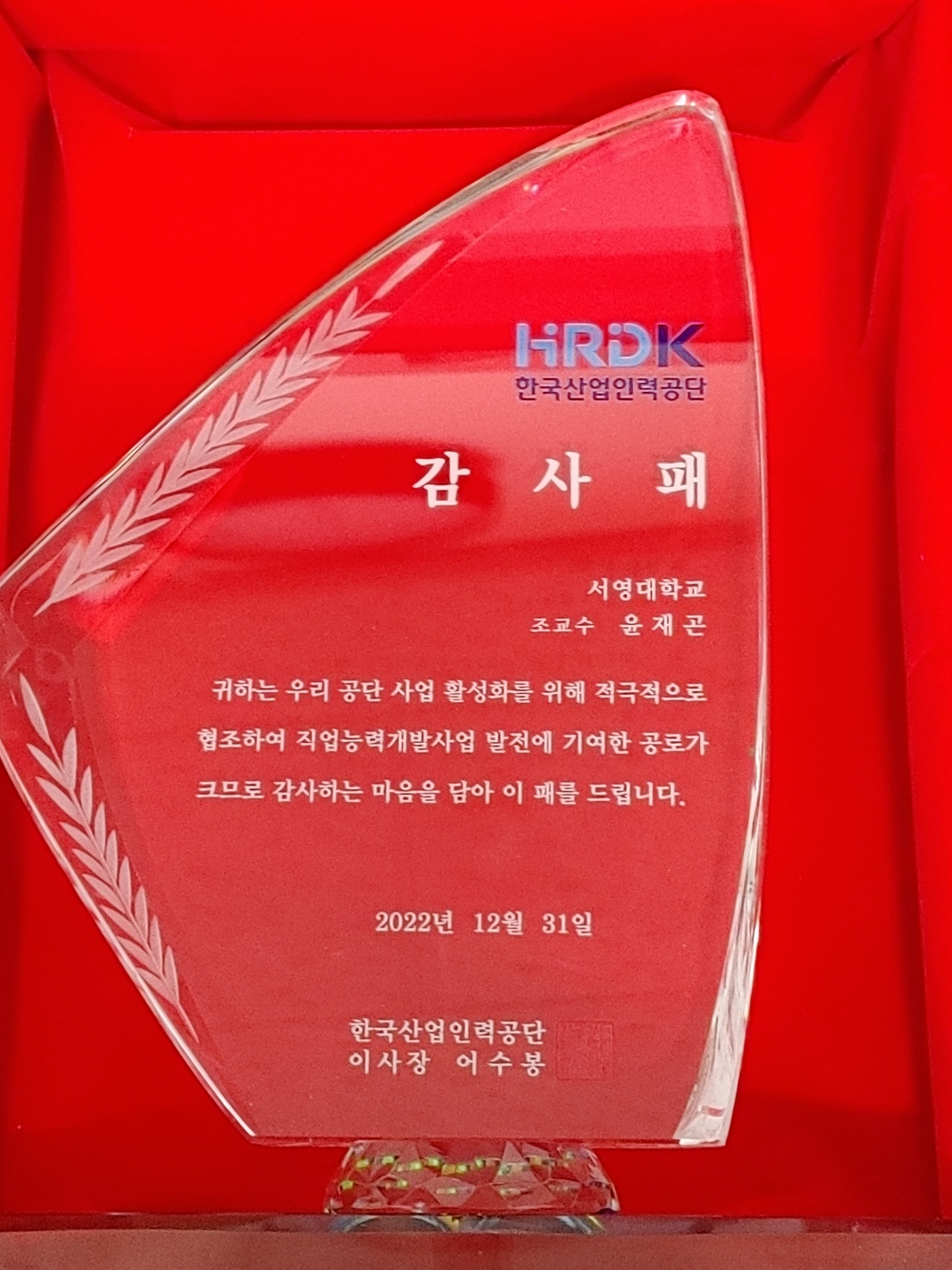 윤재곤교수 한국산업인력공단 감사패 수상