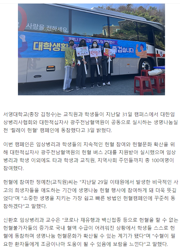 서영대학교 임상병리과에서는 혈액원주관 헌혈캠퍼인에 적극동참하여 생명나눔 헌혈문화가 확산될 수 있는 계기를 마련하였다.
