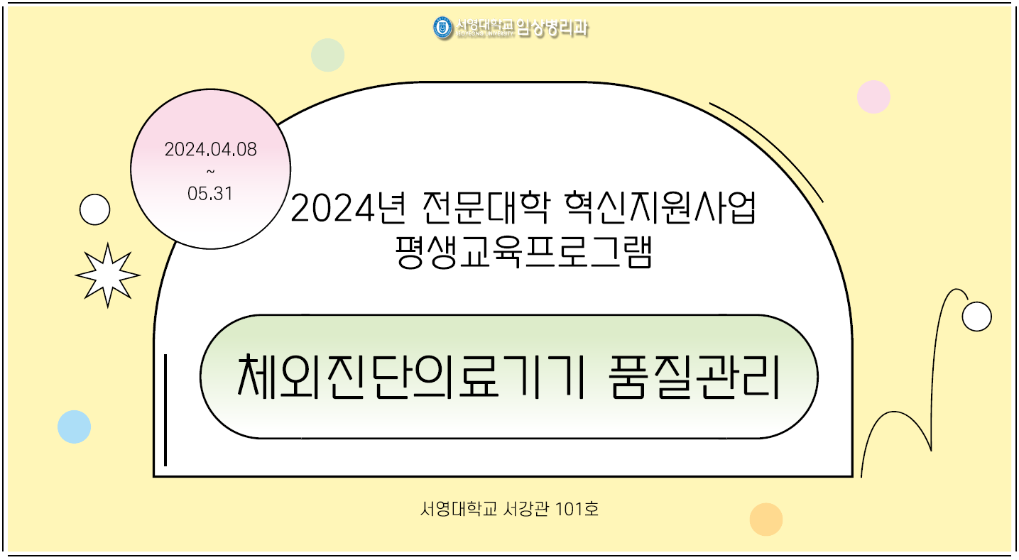서영대학교 임상병리학과에서 재학생들을 대상으로 2024년 4월 8일부터 5월 31일까지 서강관 101호에서 체외진단의료기기 품질관리 교육 프로그램을 시행하였습니다. 전문 강사분들을 모셔 IVD에 관한 학습 지도를 통해 향후 학생들의 취업에 유익할 부분과 실무능력을 향상할 기회를 마련하였습니다.