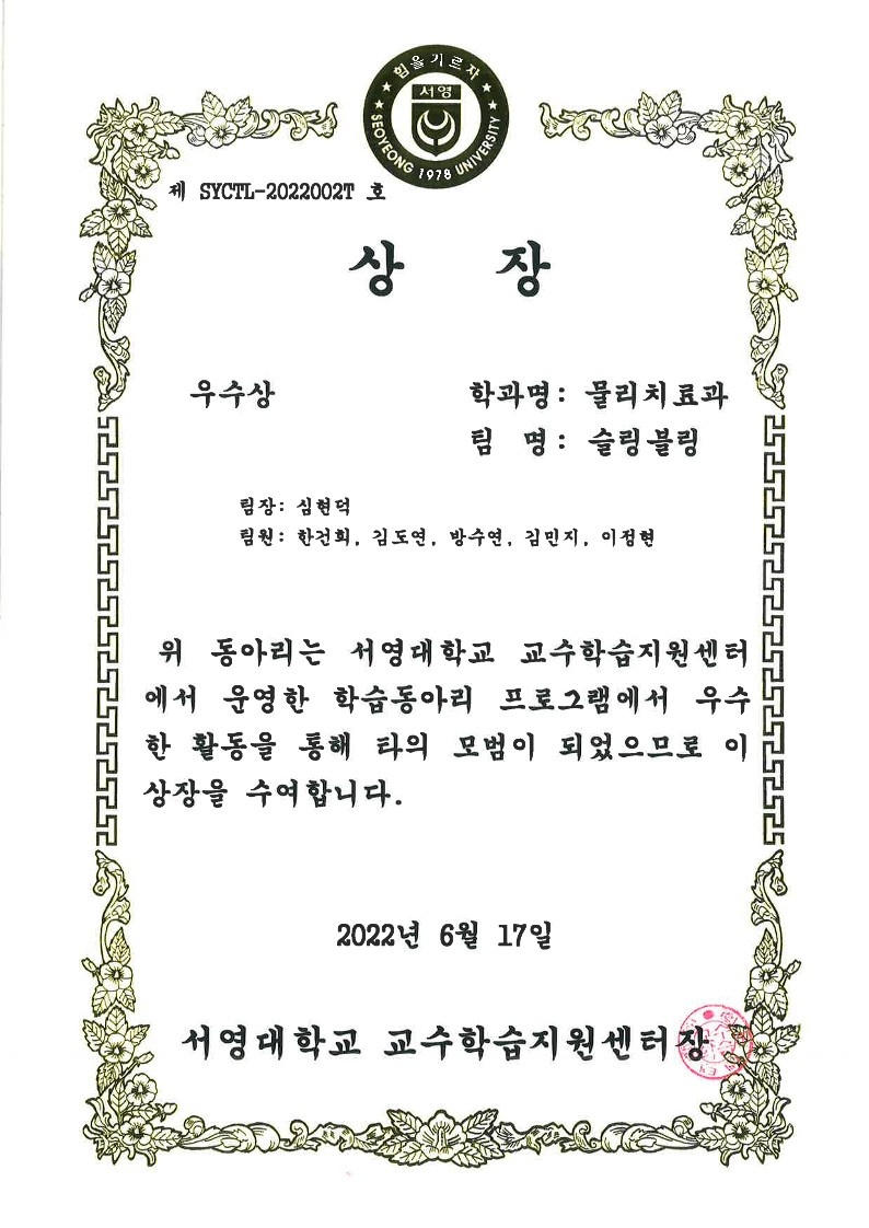 서영대학교 물리치료과 학습동아리인 슬링블링 동아리가 우수상을 받았습니다~