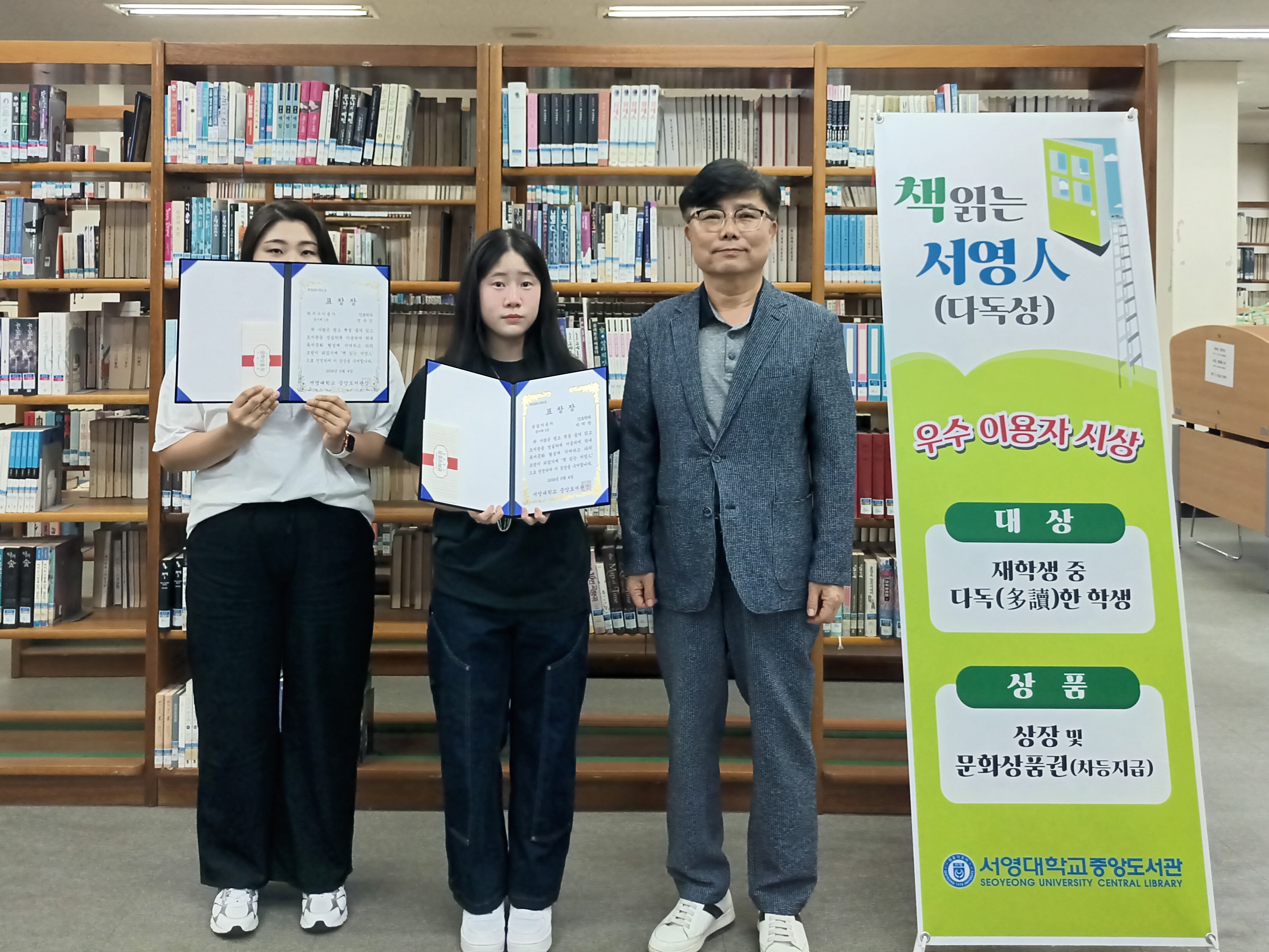 ○ 「책 읽는 서영人」 수상자로는 최우수이용자 간호학과 정유진(1), 우수이용자 간호학과 양준혁(2), 성실이용자 간호학과 박경희(3), 김유리(3), 박채완(2) 등이 선정됐으며 문화상품권을 부상으로 받았다.