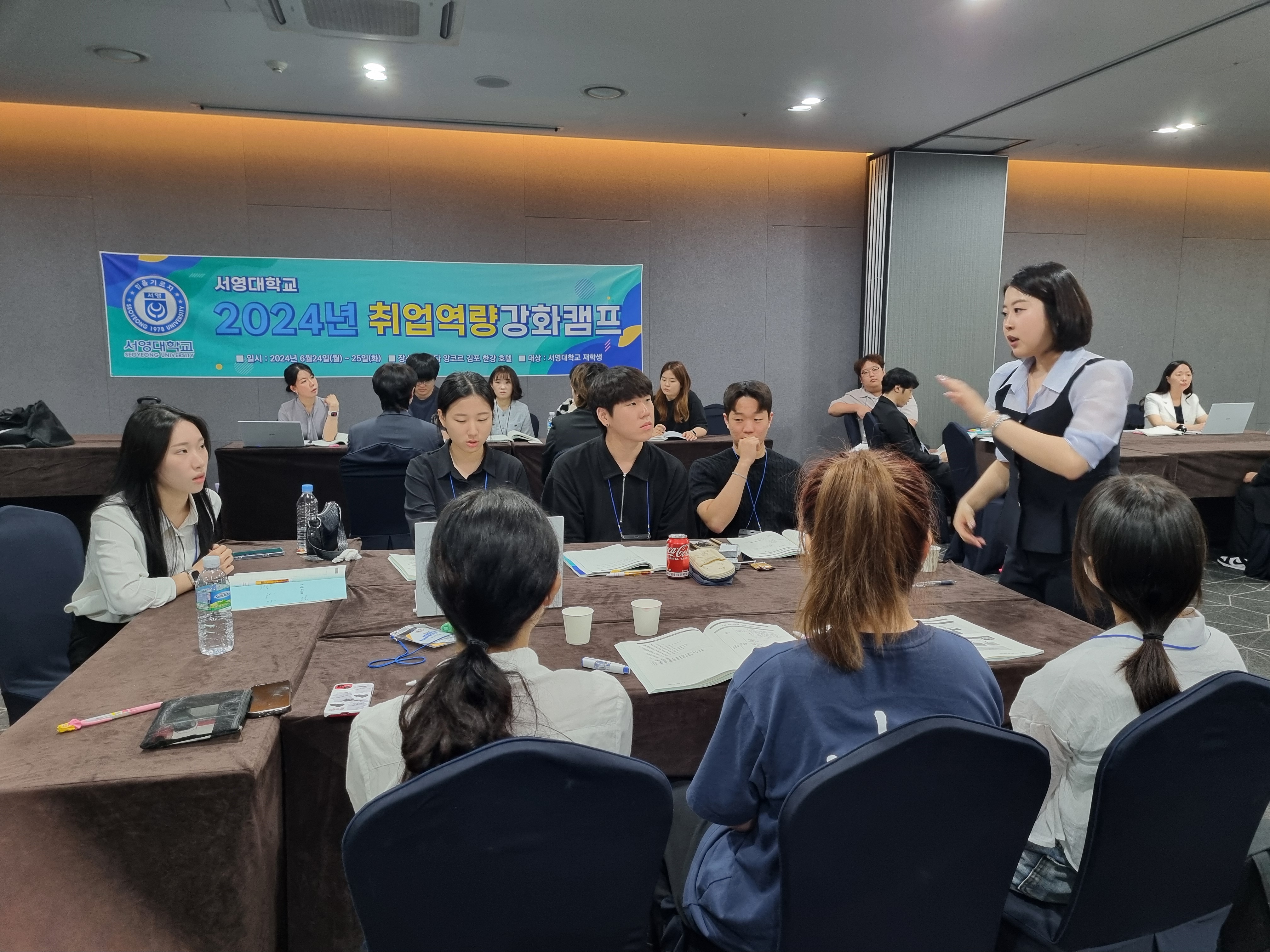 ○ 우리대학(총장 김정수)은 2024년 6월 24일(월) ~ 25일(화) 1박2일 일정으로 라마다앙코르 바이윈덤 김포한강호텔에서 9개 학과 34명의 재학생들과 함께 취업역량강화캠프를 실시하였다.