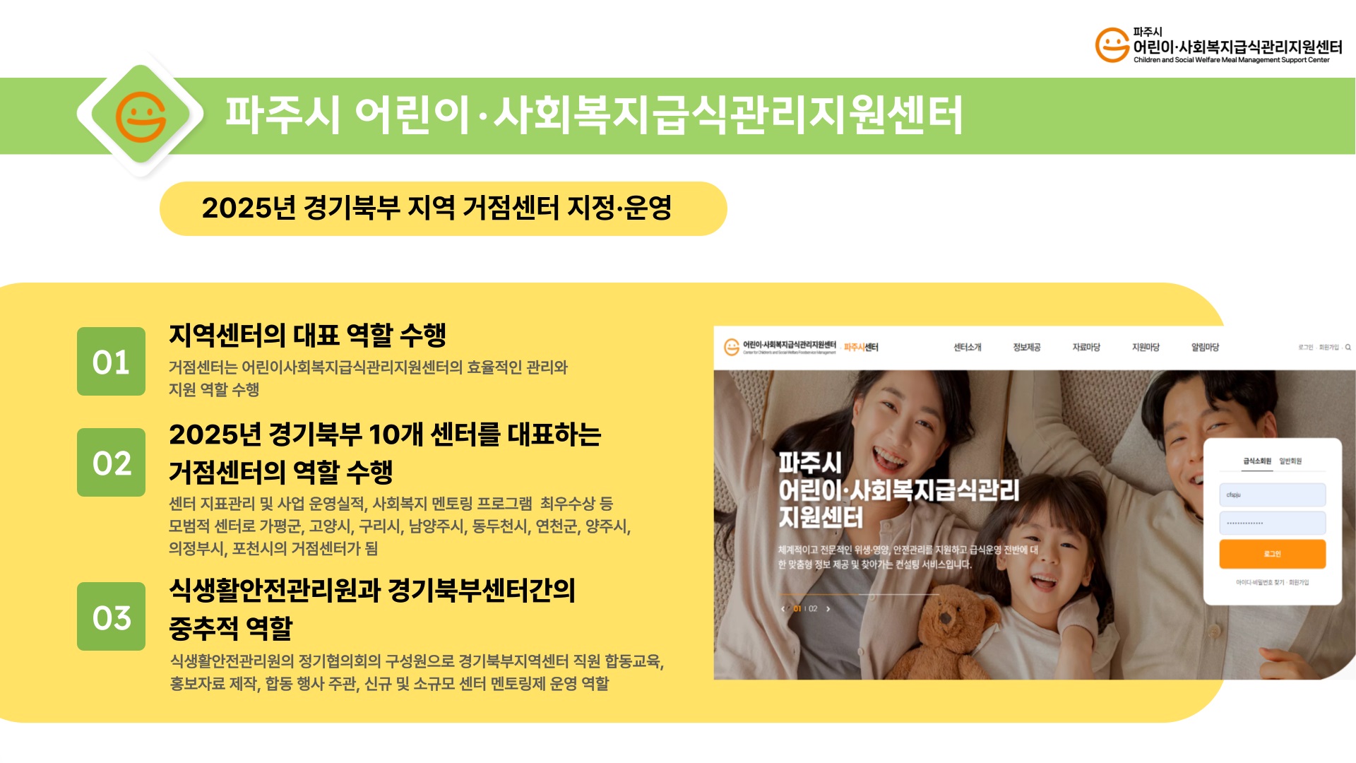 지역 거점센터는 사업 규모, 센터 운영 기간, 역량 등을 평가하여 지정되는데 파주시 어린이·사회복지급식관리지원센터는 그간 지표 관리 및 사업 운영실적, 사회복지 멘토링 프로그램 최우수상 수상 등 모범적인 센터 운영을 바탕으로 2025년 경기북부지역 10개 센터(가평군, 고양시, 구리시, 남양주시, 동두천시, 연천군, 양주시, 의정부시, 포천시)를 대표하는 거점센터로 지정되었다.