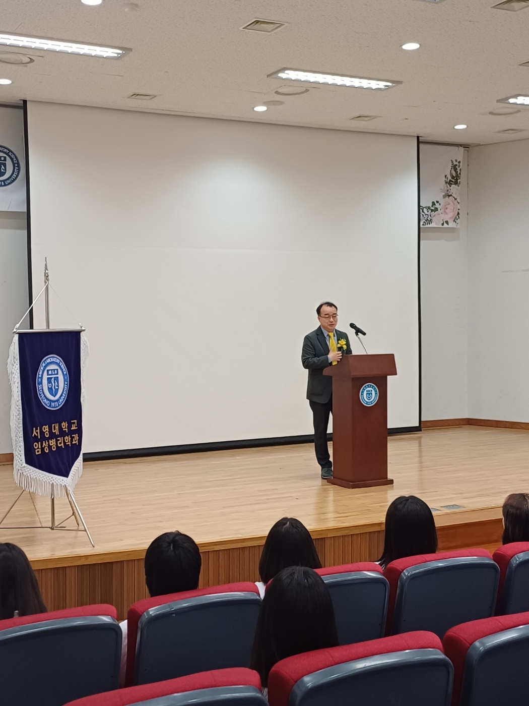 O. 입학홍보처장 장철인 교수는 축사를 통해 '임상병리사 윤리강령 선서식을 통해 임상병리사로서 갖추어야 할 이론과 임상실습을 통하여 직업에 대한 자긍심과 더불어 사명감을 갖고 환자의 질병진단검사에 책임을 다하는 임상병리사이자 의생명과학자가 될 수 있도록 부단히 노력해 주시길 바란다.'고 응원의 말을 전하였다.