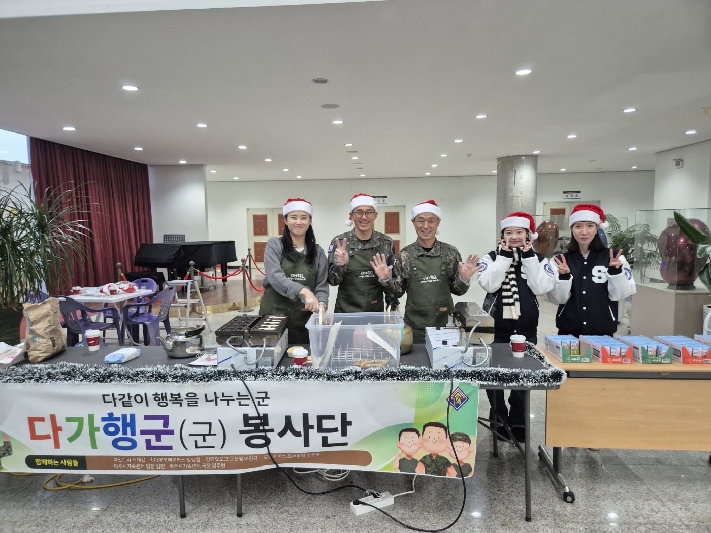 ○ 우리대학(총장 김정수)은 재학생들의 학업 응원을 위해 12월16일(화) 제2기갑여단 군 봉사동아리 '다가행군'과 함께 붕어빵 나눔행사를 진행하였다. 서영관 로비에서 진행된 붕어빵 나눔이벤트는 기말고사를 앞두고 학업에 매진하고 있는 재학생들에게 따뜻한 응원의 마음을 전하고자 마련된 행사이다. 제2기갑여단 군 봉사 동아리 '다가행군' 소속 간부들은 직접 붕어빵을 구워 학생 및 교직원에게 나누며 추운 날씨 속 온기를 전했다.