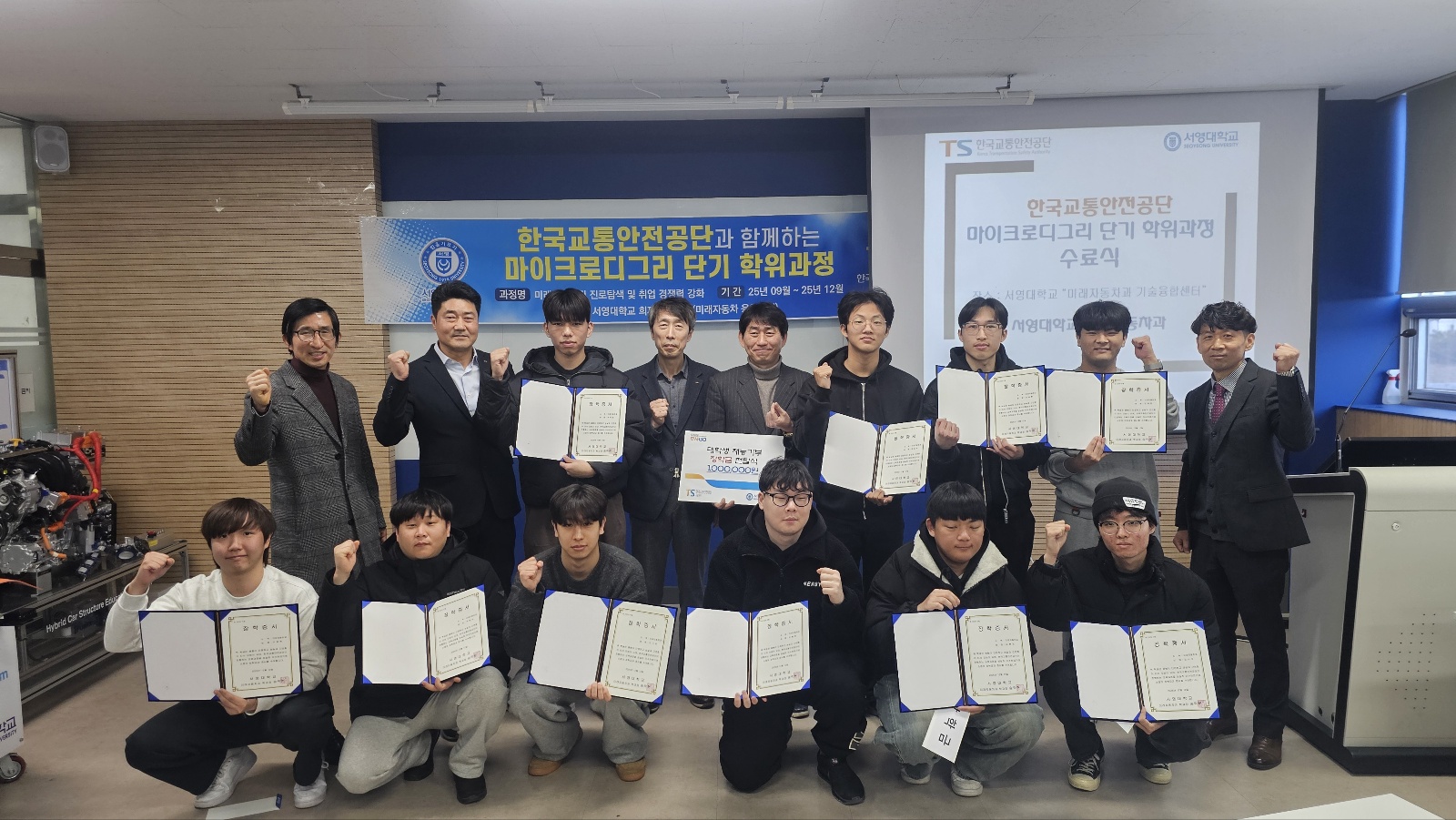 서영대학교(총장 김정수) 미래자동차과(학과장 송락현)20251212() 한국교통안전공단 서울본부와 공동으로 운영한 마이크로디그리 단기 학위과정의 성공적인 운영을 기념해 수료식 및 장학금 수여식을 진행하였다.